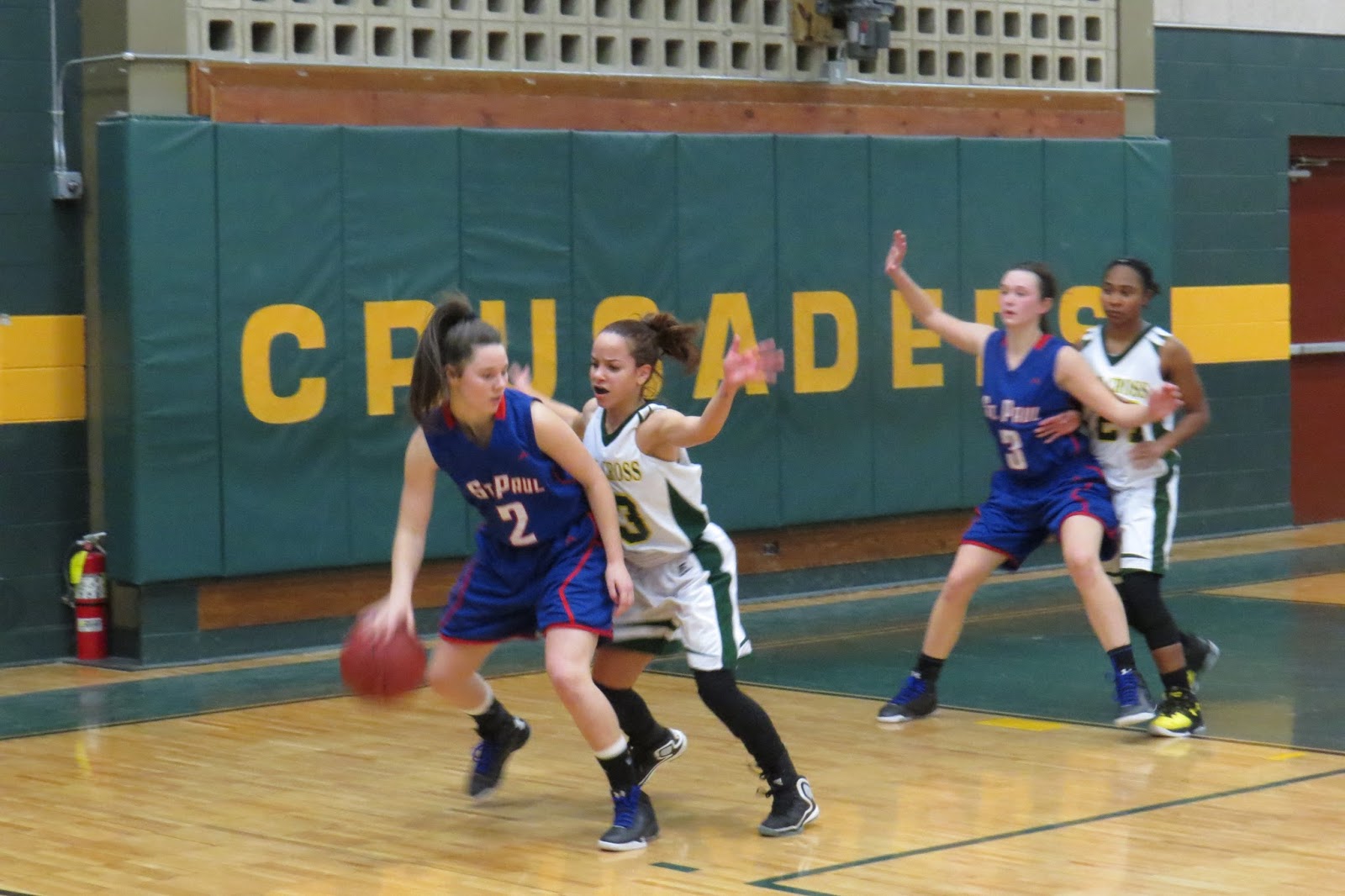 The Crusaders led 17-12 at the half, then extended the advantage to 32-25 by halftime. In the third quarter, Holy Cross turned up the heat and outscored St. Paul 26-13 to build a 20-point lead, 58-38.