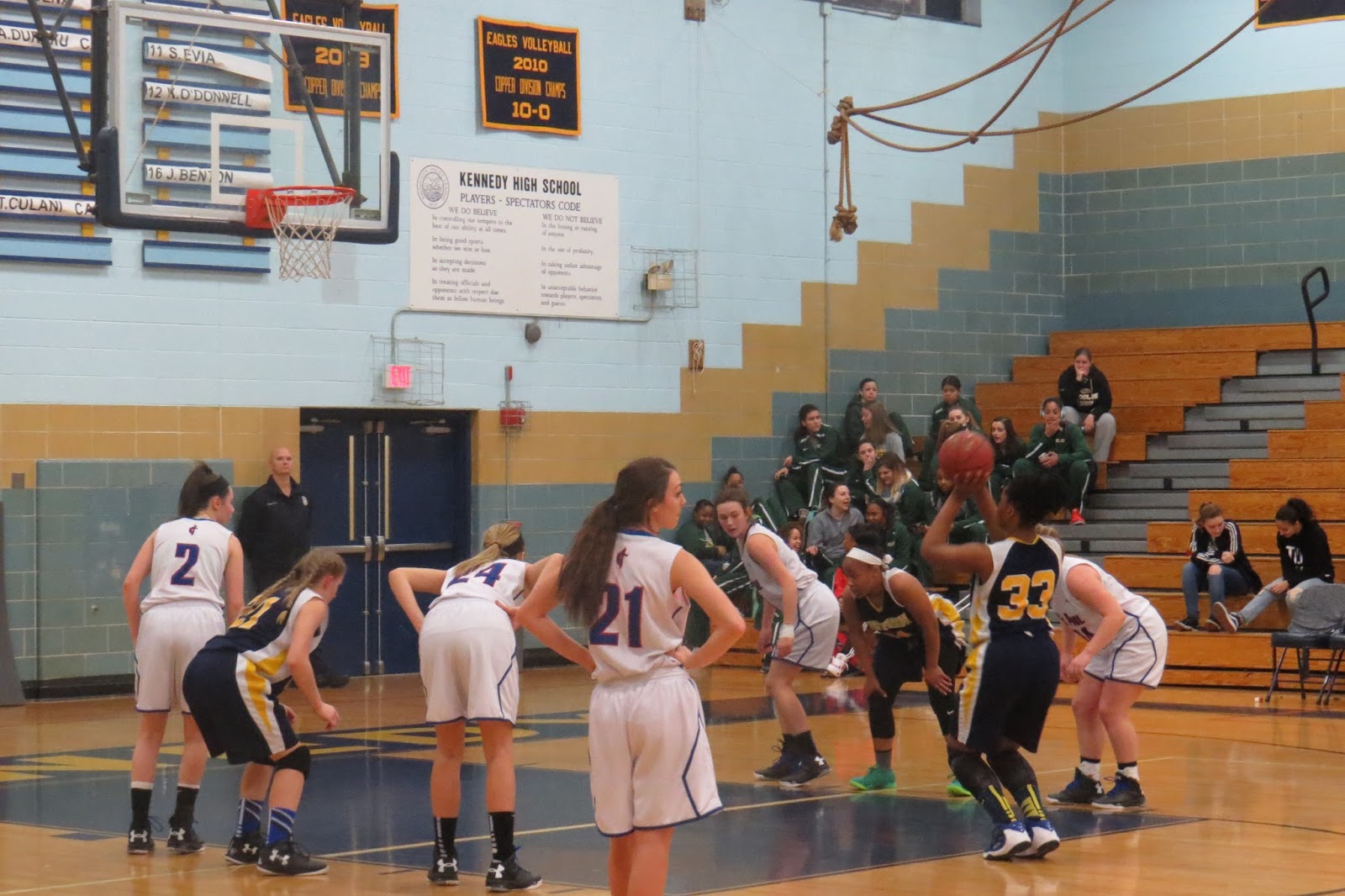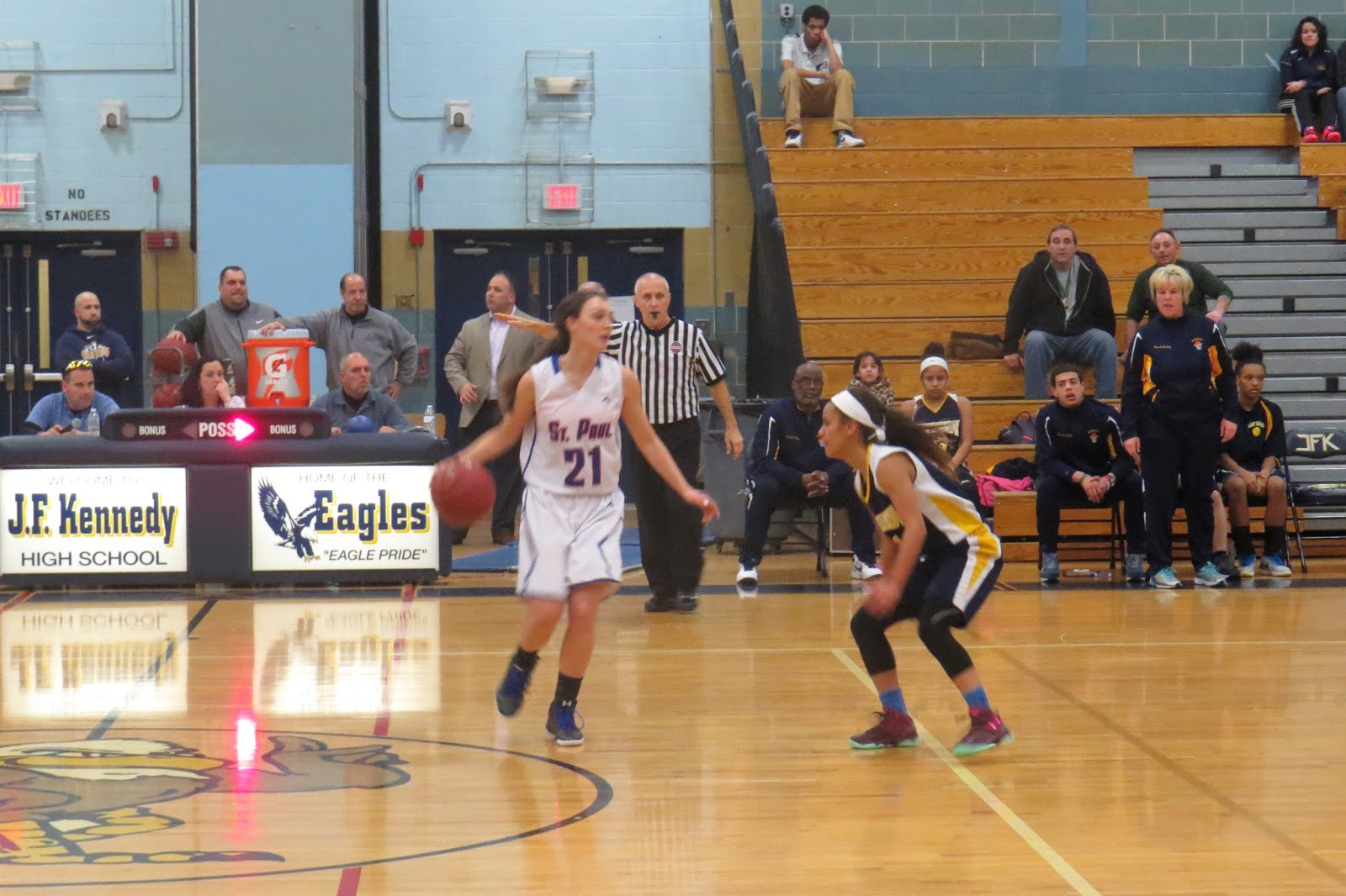 Whiting’s 3-pointer with 2:17 left in the first half gave Kennedy the lead for good at 22-21. Whiting had seven second quarter points as the Eagles built at 24-23 halftime lead. Prather got Kennedy off to a solid start with all eight of her first half points coming in the first quarter. The big sophomore was a big pain for St. Paul all night on the backboards.