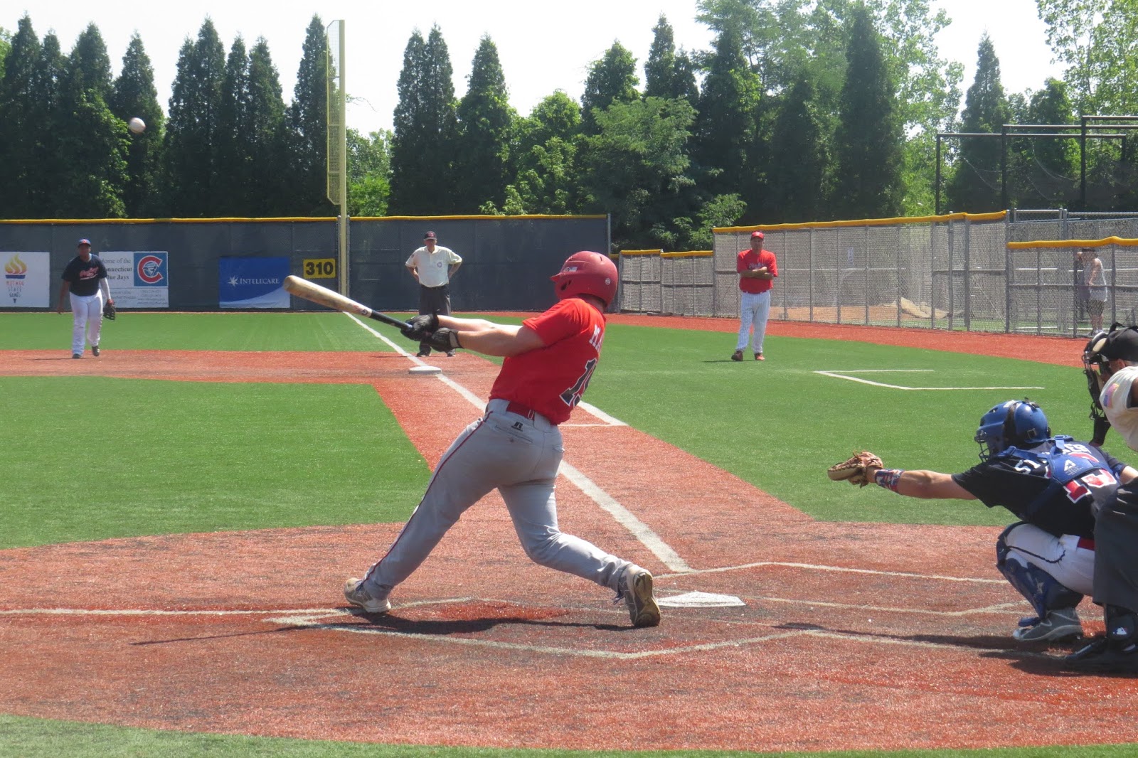 | Bristol’s Zach Marquis singles to right center field. Marquis played right field and pitched for Team Red in the first game of the Rawlings Futures Showcase at Balf-Sakin Field on the campus of CCSU. |