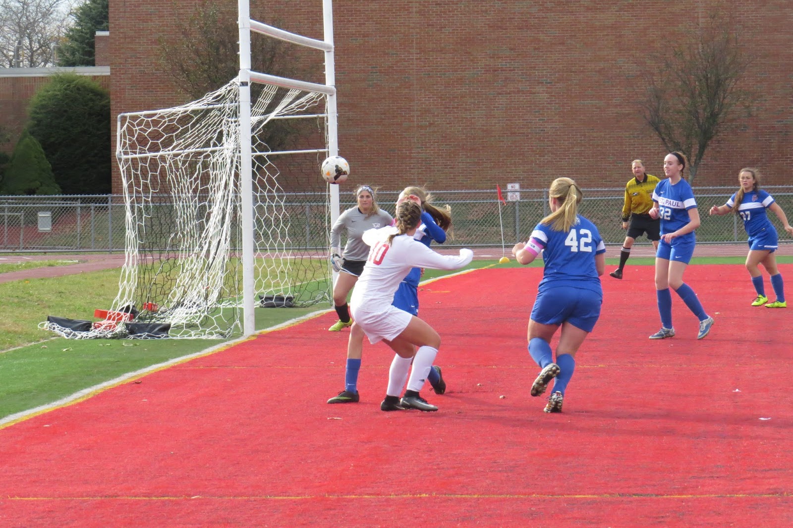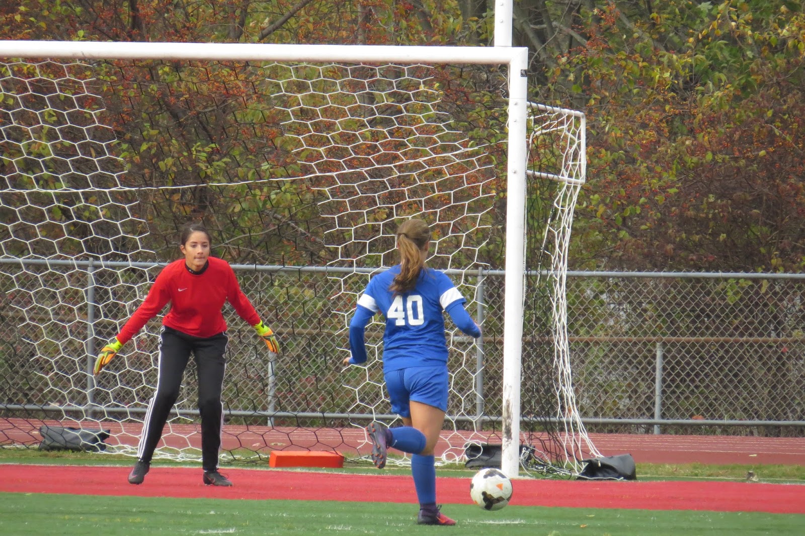 The Falcons made some runs at the Eagle goal in the second half, and a couple nearly resulted in goals. One shot from Julia Dess dribbled just to the right of the near post with 23:23 left in regulation. At 21:08, Dess was at it again and clanked a low ball off the left post. At 19:48, Wolcott keeper Cynthia Dias was able to recover a dangerous loose ball in front of her goal.