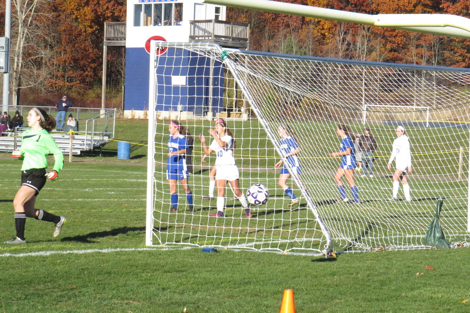 St. Paul’s Julia Dess (40 in white) can’t hide her disappointment as a Falcon shot ends up wide right of the Old Saybrook goal during Friday’s Class S quarterfinal. |