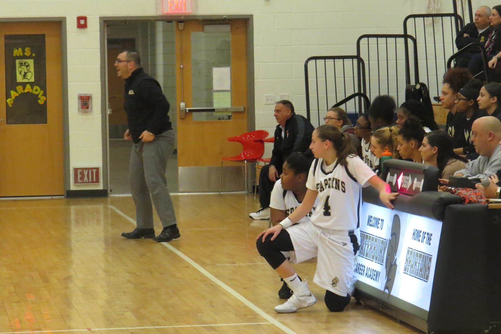 WCA head coach Stephen Barbieri yells out instructions as Armani Weaver (left) and Alyssa Chouinard wait to check back into Friday’s Class M qualifying round game. The Spartans claimed the first postseason win in program history. |