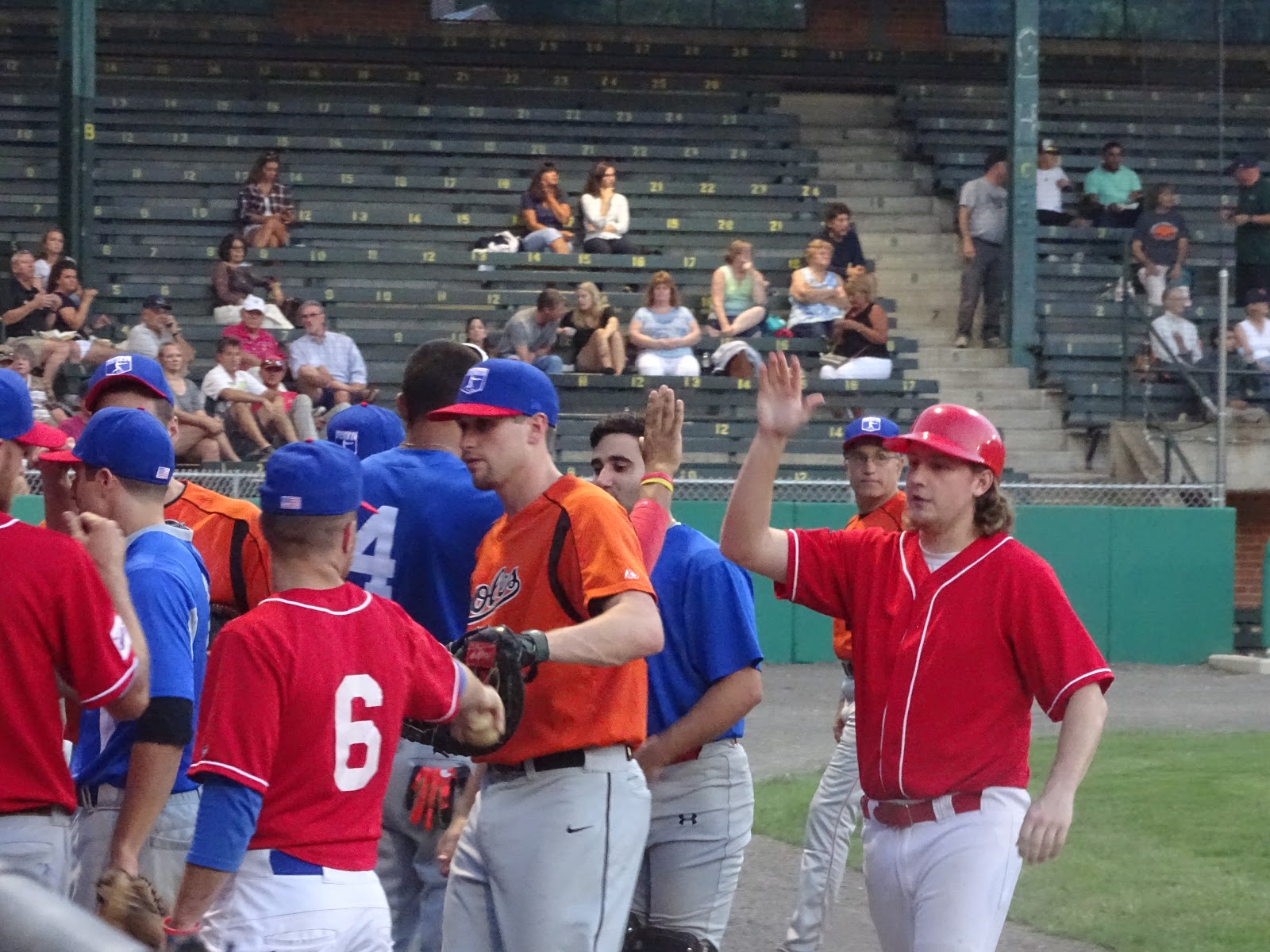 The Greater Hartford Twilight Baseball League all-stars congratulate each other at the end of an inning during Monday night’s game. (Copyright, Sports on CT-69) |
