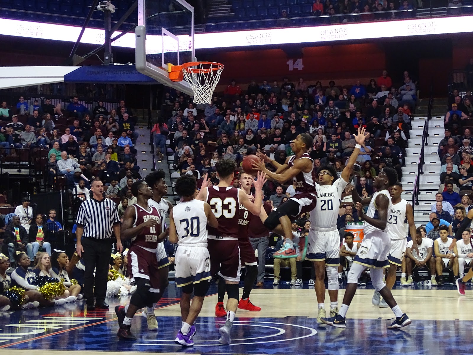 Two foul shots from junior Josh Reaves put the Lancers up 54-51 at 3:56. Solomon then seized the moment with four straight points, and his most spectacular sequence of the night put the Hearts ahead for the last time in the 2017-18 season.