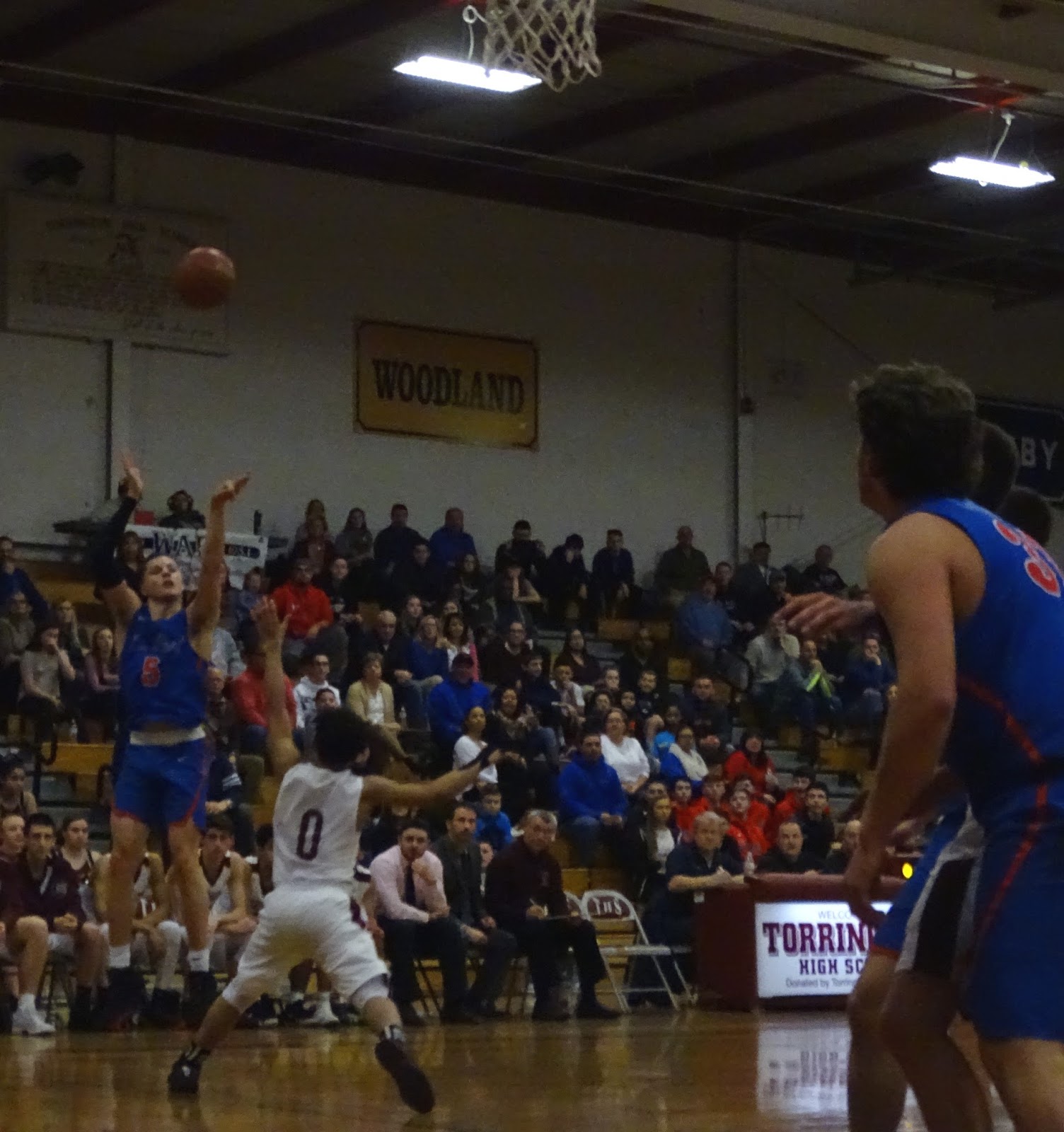 St. Paul’s Tyler Arbuckle launches a 3-pointer as teammate Darek Wiecki gets into position under the basket during Friday night’s game at Torrington.(Copyright, Sports on CT-69) |