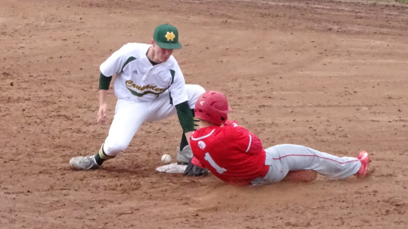 Wolcott’s Nick Longo is safe on his steal attempt as the ball escapes the glove of Holy Cross shortstop Will Greene. (Copyright, Sports on CT-69) |
