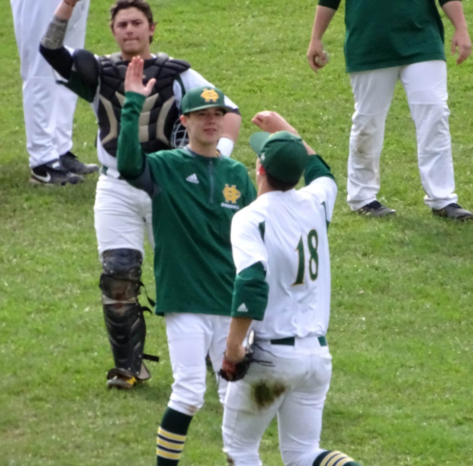 Holy Cross right fielder Tim Zupkus receives high-fives after his sliding catch in foul territory ended the third inning of Monday’s game against Wolcott. (Copyright, Sports on CT-69) |
