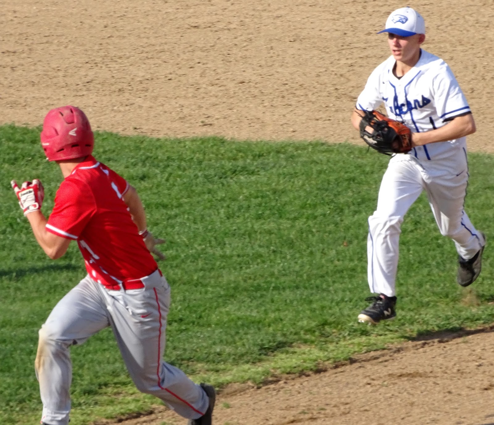| St. Paul shortstop Ethan Rembish chases after Wolcott’s Anthony Ligi during a rundown in Monday’s game. (Copyright, Sports on CT-69) |